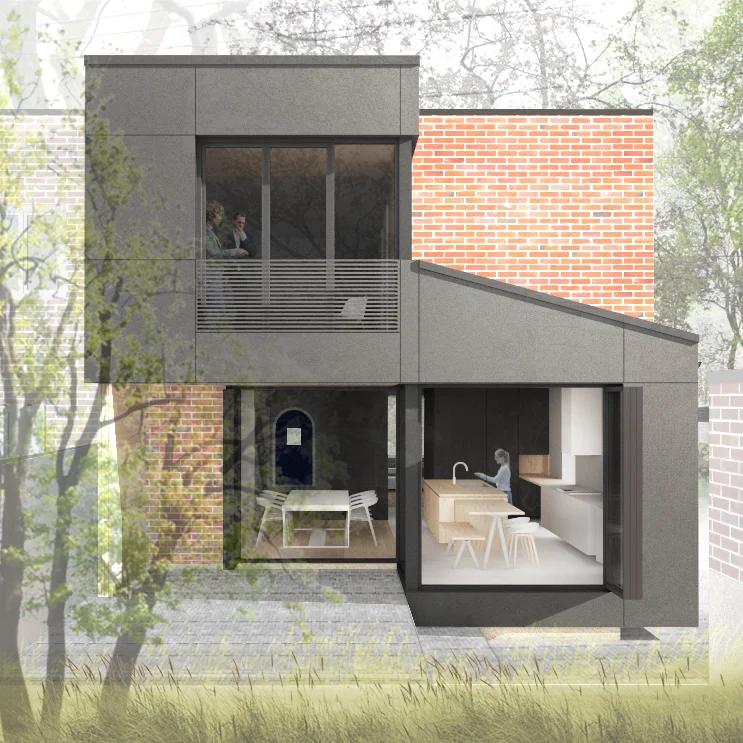 Agrandissement et réaménagement complet d'un cottage en brique typique de ce quartier montréalais. La démolition vient tout juste de commencer. Plusieurs images de sa mise en oeuvre à venir, mais pour l'instant, voici une petite vignette préliminaire de l'intervention sur cour.